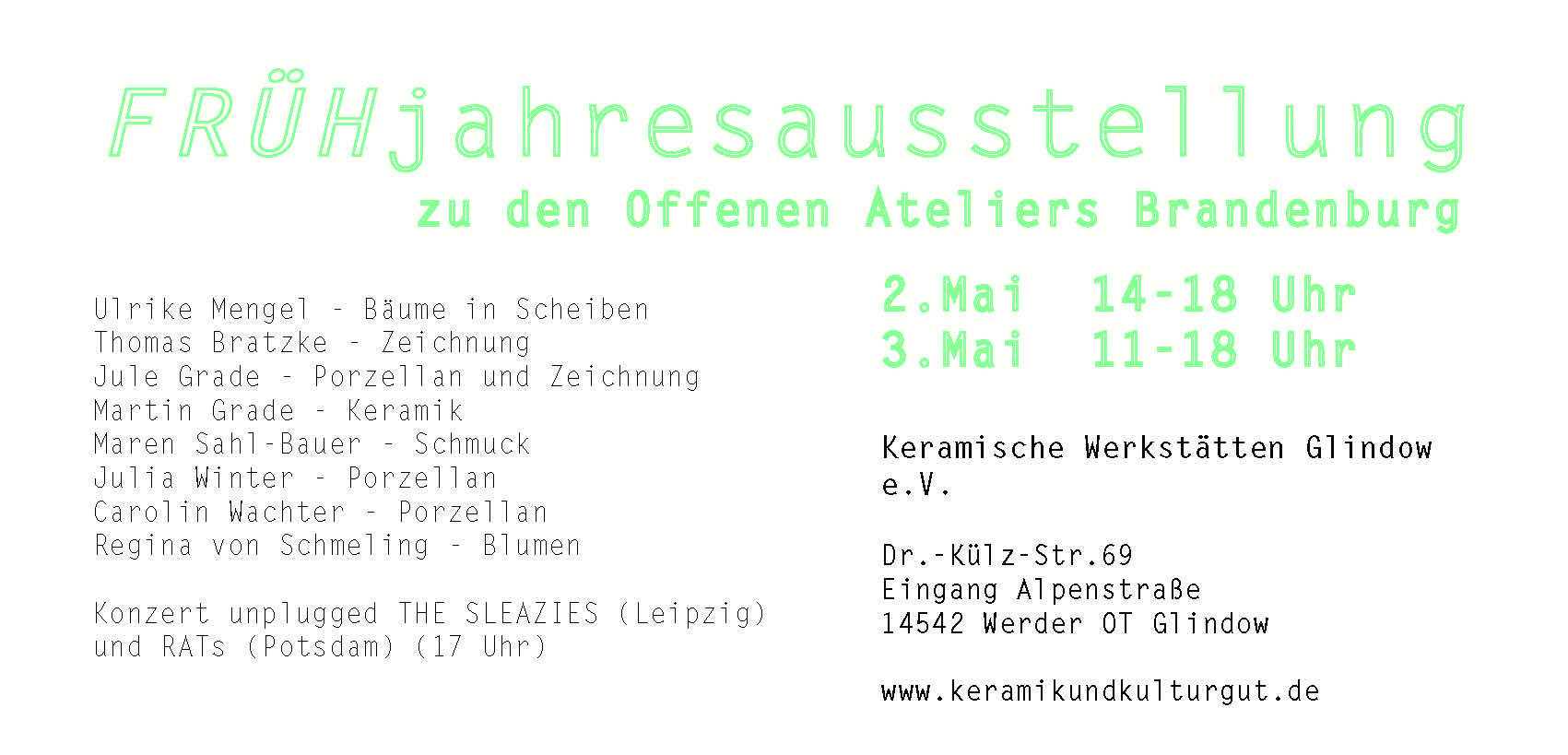 Zur FRÜHjahresausstellung der Keramischen Werkstätten Glindow laden wir Sie am 2. Mai (14 - 18 Uhr) und am 3. Mai (11 - 18 Uhr) herzlich auf das Keramik&KulturGUT Glindow ein.
